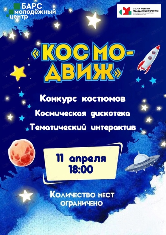 11 апреля в 18:00 на базе Молодежного центра "Барс" состоится развлекательная программа, посвященная Дню космонавтики "КосмоДвиж".